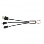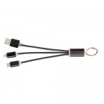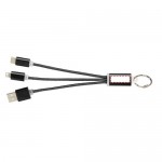 Cavo di ricarica 3 in 1 con portachiavi in metallo. Il cavo di ricarica in metallo 3 in 1 con portachiavi dispone di 1 attacco di tipo C, 1 USB di tipo A e un doppio attacco 2 in 1 compatibile con dispositivi Apple iOS e Android. È dotato di un portachiavi. Per caricare i dispositivi Apple inserire il cavo con il lato privo di pin nel dispositivo e per caricare i dispositivi Android inserire il cavo con il lato che presenta i pin nel dispositivo.