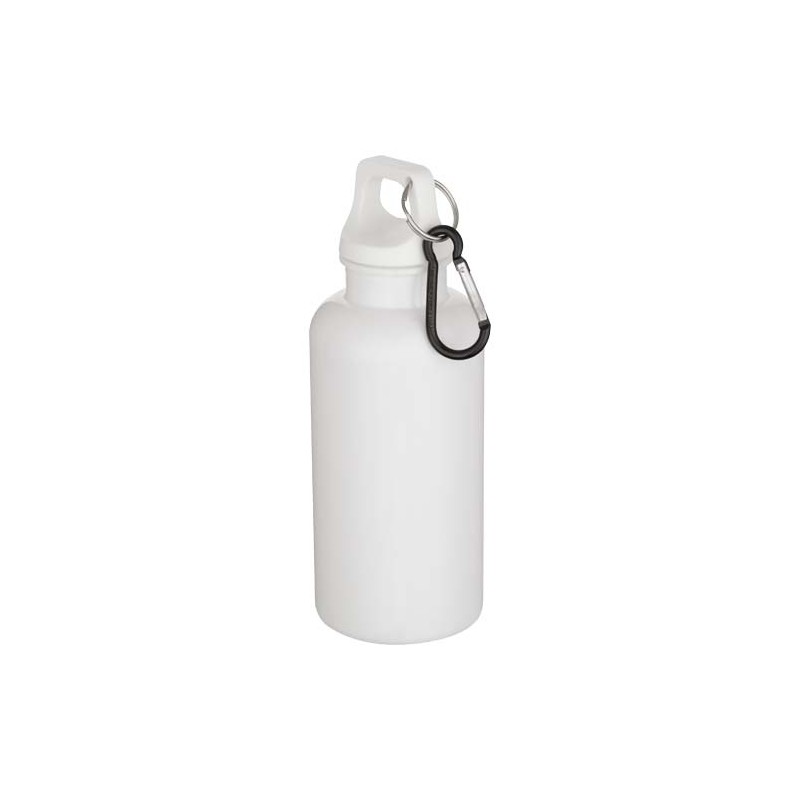 Questa borraccia leggera e al tempo stesso resistente in PET riciclato certificato RCS da 400 ml è perfetta per idratarsi in qualsiasi momento. È l'accessorio perfetto durante l'esercizio fisico e le gite di un giorno oppure da portare in ufficio. La borraccia a parete singola Oregon è dotata di un coperchio a vite e di un'ampia superficie che consente di aggiungere qualsiasi tipo di logo. Per evitare di perderla, potrai agganciare saldamente il moschettone in dotazione (non adatto per l'arrampicata) a una borsa. Realizzata in conformità con il processo di riciclaggio del PET approvato dall'EFSA.
