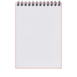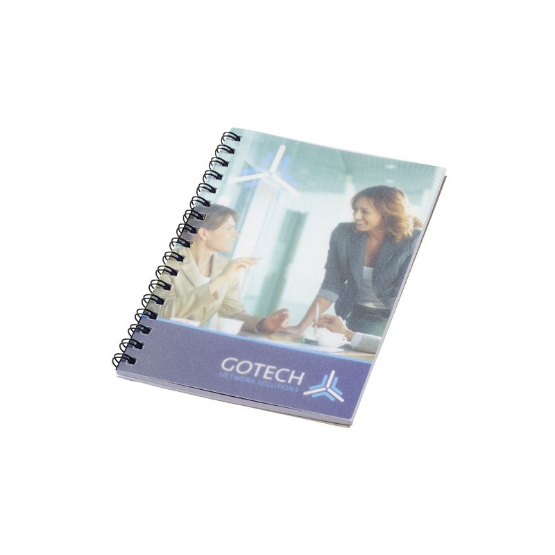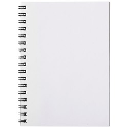 Blocco note spiralato di formato A6 Desk-Mate®. Include 50 fogli di carta bianca da 80 g/m2, una copertina frontale in carta lucida (250 g/m²) ed una sovra copertina da 450 micron in polipropilene trasparente. Spirale nera o bianca. Puoi personalizzare le pagine di questo versatile blocco note con qualsiasi design - sia che tu voglia fogli a righe, a quadretti o puntinati - tutto è possibile!