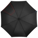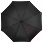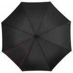 Ombrello dal design esclusivo con asta in metallo, stecche in fibra di vetro e manico in plastica gommata. Fornito con custodia che richiama il colore della copertura.