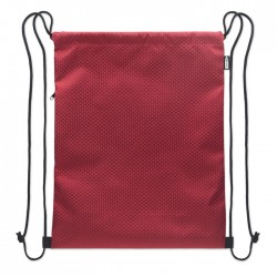 Sacca in poliestere RPET 420D con tasca laterale verticale con zip e fodera in RPET 210D. Presenta corde resistenti su entrambi i lati. Capacità 4,5L, carico massimo 5 kg.