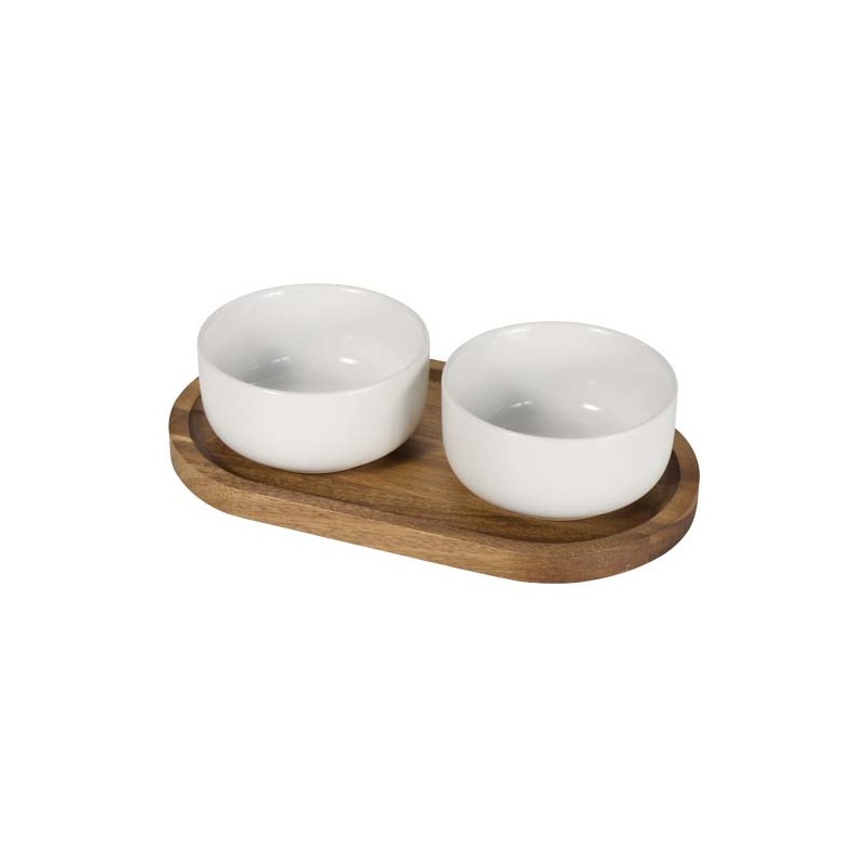 Set di due ciotole da portata in ceramica con vassoio in legno di acacia. Ideale per salse, spuntini o contorni. Durevole, elegante e perfetto per l'intrattenimento o per l'uso quotidiano. Le ciotole sono lavabili in lavastoviglie. [video][/video] [video][/video]